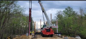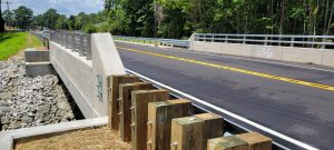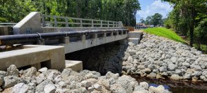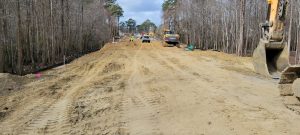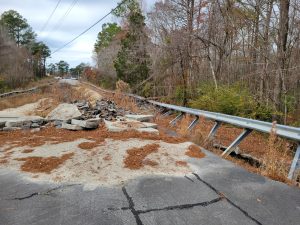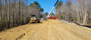 This project consists of replacing 3 culvert pipes and a roadway that was partially destroyed from Hurricane Florence with a single span 50′ cored slab bridge. More specifically: 2 Acres of clearing and grubbing, removal of 3 60″ CMP storm pipes, Erosion and Sediment control of approximately 3 Acres, import of 500 cy of select fill for roadway construction, 900 tons of ABC base, 0.5 mile of asphalt roadway, 800 LF of new gravity sanitary sewer with 5 new manholes 8′ depth, 800 LF of waterline construction, 1200 LF of guardrail, 50′ of cored bridge slabs, 2 end bents with 1200 LF of HP, 80 wall feet of sheet piling, 100 LF of barrier wall, and 400 LF of curb and gutter.