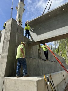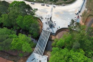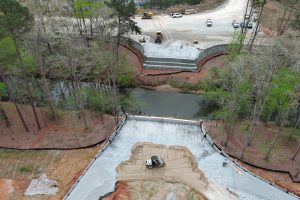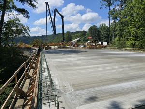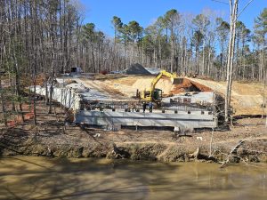 This project consisted of all labor, equipment, materials and supervision to construct a 115 ft. x 60 ft. bridge structure to facilitate a mine expansion across Crabtree Creek. This structure was designed to handle all clearing, overburden removal and mine rock hauling from expanded quarry land to the current mine operations. This project was designed in conjunction with Micheal Baker International (RDU) and can handle CAT 773 (65 Ton) off road trucks and other construction related equipment. The design consisted of HP 14×89 steel piling, concrete end bents, MSE retaining walls, 72” modified bulb tee girders and 12-inch-thick concrete deck. Environmental permitting concerns were addressed with the US Army Corp of Engineers, no rise impact permitting, Neuse River buffer zone with strict set back rules for permanent structures as well as North Carolina Department of Environmental Quality (DEQ) erosion control permitting and associated measures.