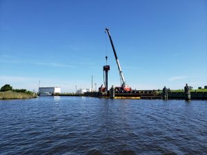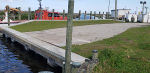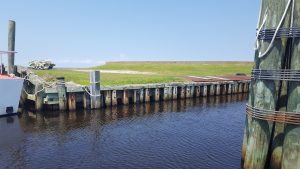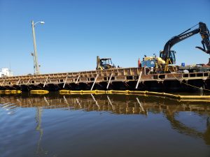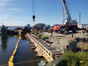 This project consists of the rehabilitation of an existing bulkhead at MCAS Cherry Point island BT-11. More specifically this project consisted of multiple barge mobilizations; installation of erosion control, 165 wall feet of new AZ sheet piles, 16 earth anchors, 165 LF of concrete coping, 21 EA 12″ diameter timber piles, whalers, and connections, 100 TN of ABC, 400 SY of sod, and QC personnel.