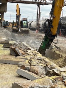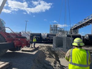 Trader Construction was contracted by an industrial client to remove and replace a precast concrete railcar sulfur dump trench system critical to plant operations. The system allows molten sulfur to be discharged from railcars into a trench, where it flows to a central collection sump. The project scope included demolition of the existing trench, subgrade preparation, installation of new precast trench sections, and placement of a 125,000-pound precast sump. Additionally, new rail was installed atop the trench system. Executed during a continuous 7-day-a-week plant shutdown, this high-priority project demanded precision and efficiency under a challenging timeline—which was successfully met without delay.