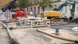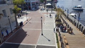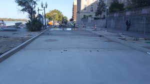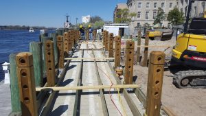 This project included providing all labor, equipment, materials, and supervision to install underground utilities; repair approximately 160 linear feet of sheet pile; place new concrete bridging slabs; build a new park at the foot of Market Street; install streetscaping along portions of Water Street; patch the roadway along portions of Water Street; and replace storm sewer drainage at the Princess Street intersection. Work included hauling, sewer, grading, demolition, erosion control, traffic control, excavating, asphalt paving, curb & gutter, pavers, silt fencing, electrical, and concrete. Alternate work included complete streetscaping between Market and Princess Streets, a new fountain foundation, and a new park in front of the Federal Building; exterior renovations to the Visitor’s Center; replacing timber decking at the Visitor’s Center; replacing the Riverwalk